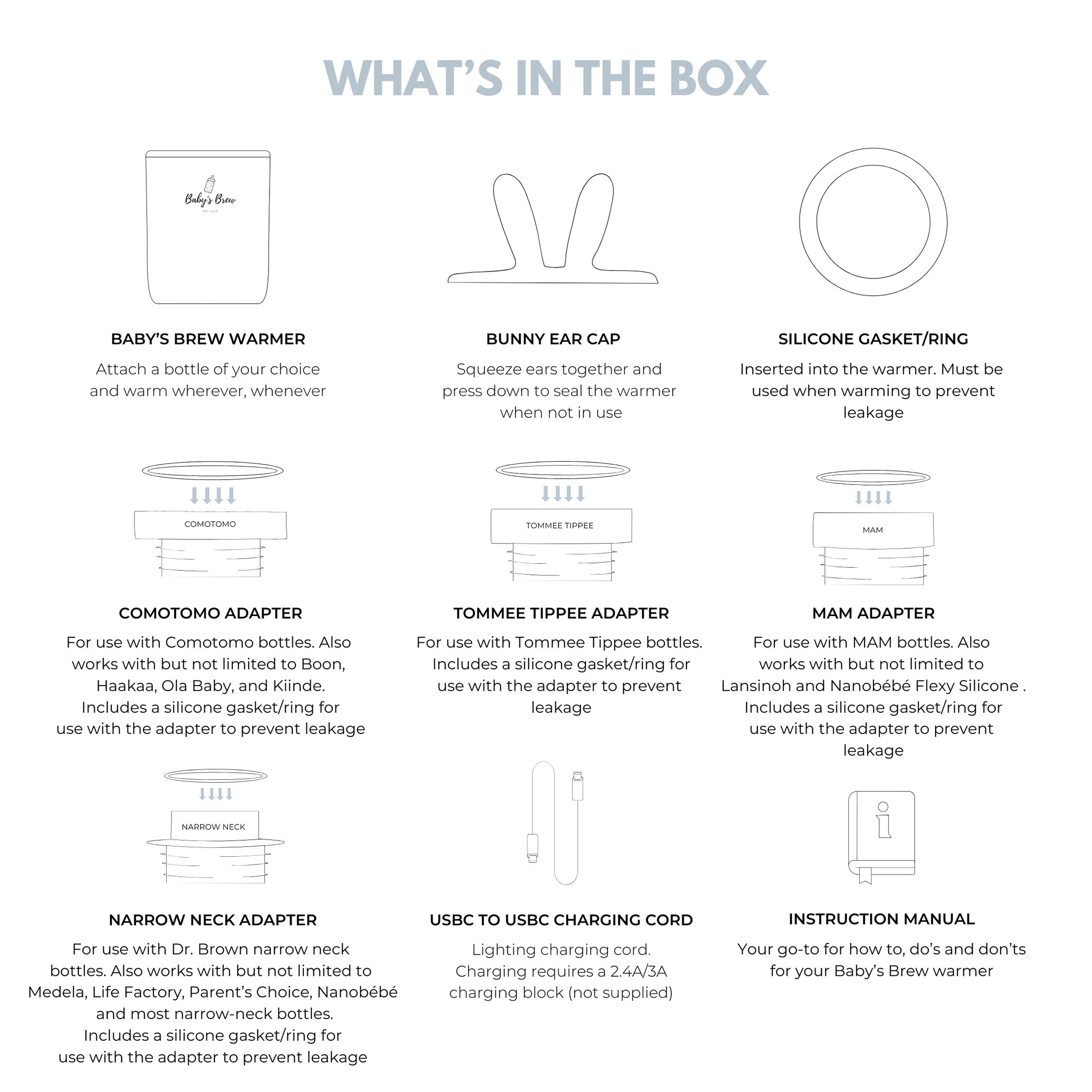 The warmer set includes four of our most popular adapters. These adapters are compatible with Comotomo, MAM, Narrow neck Dr. Brown, and Tommee Tippee bottles, and each of them accommodates multiple bottle brands. To find a comprehensive list of bottles that are compatible with each adapter, please visit our adapter page.