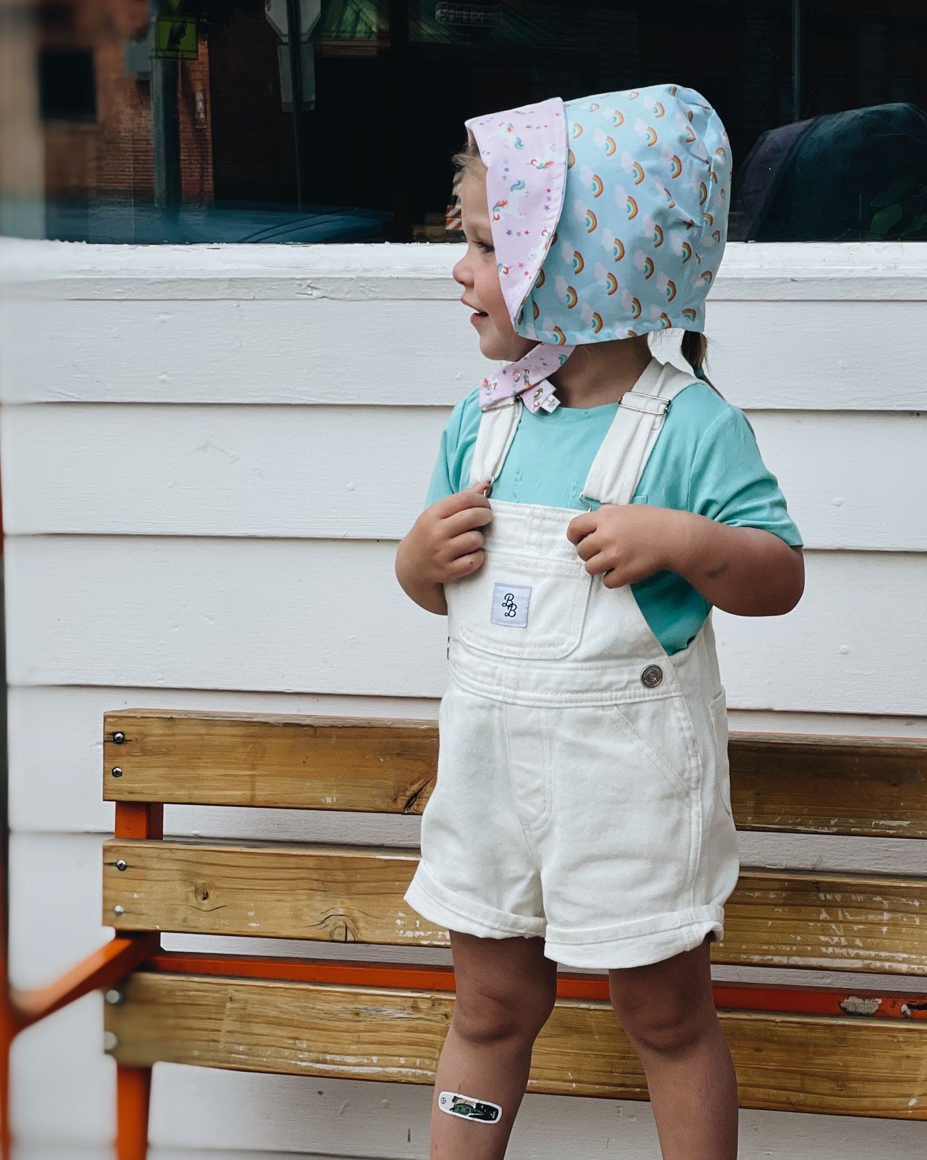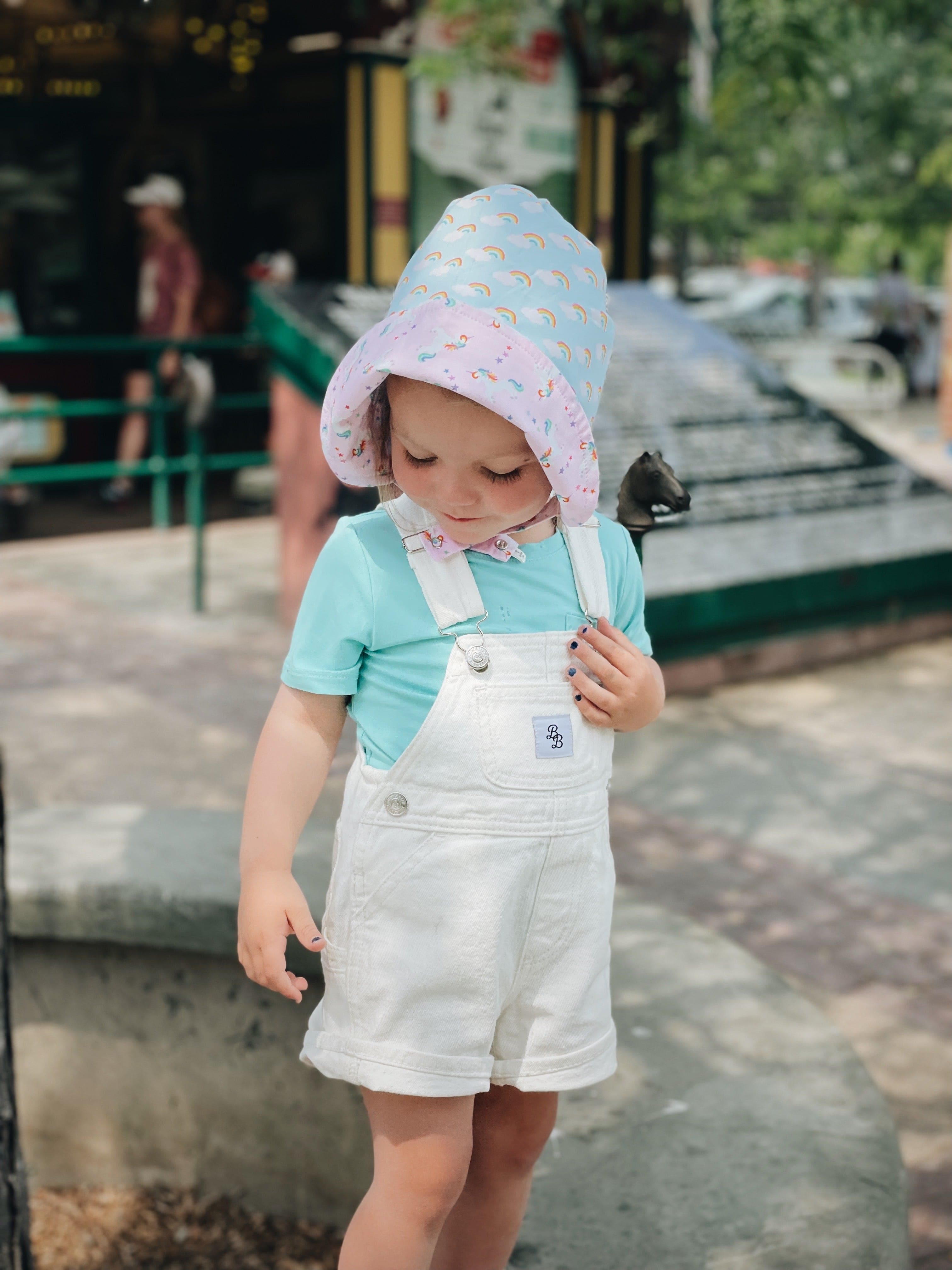 Stay covered, protected and dreamy in this Bonnet in Believe! Featuring rainbows, puffy clouds, unicorns, and our stellar UPF 50+ sun protection, it's perfect for a magical day outdoors. Machine washable for easy care, this bonnet is sure to make your little one even MORE adorable!