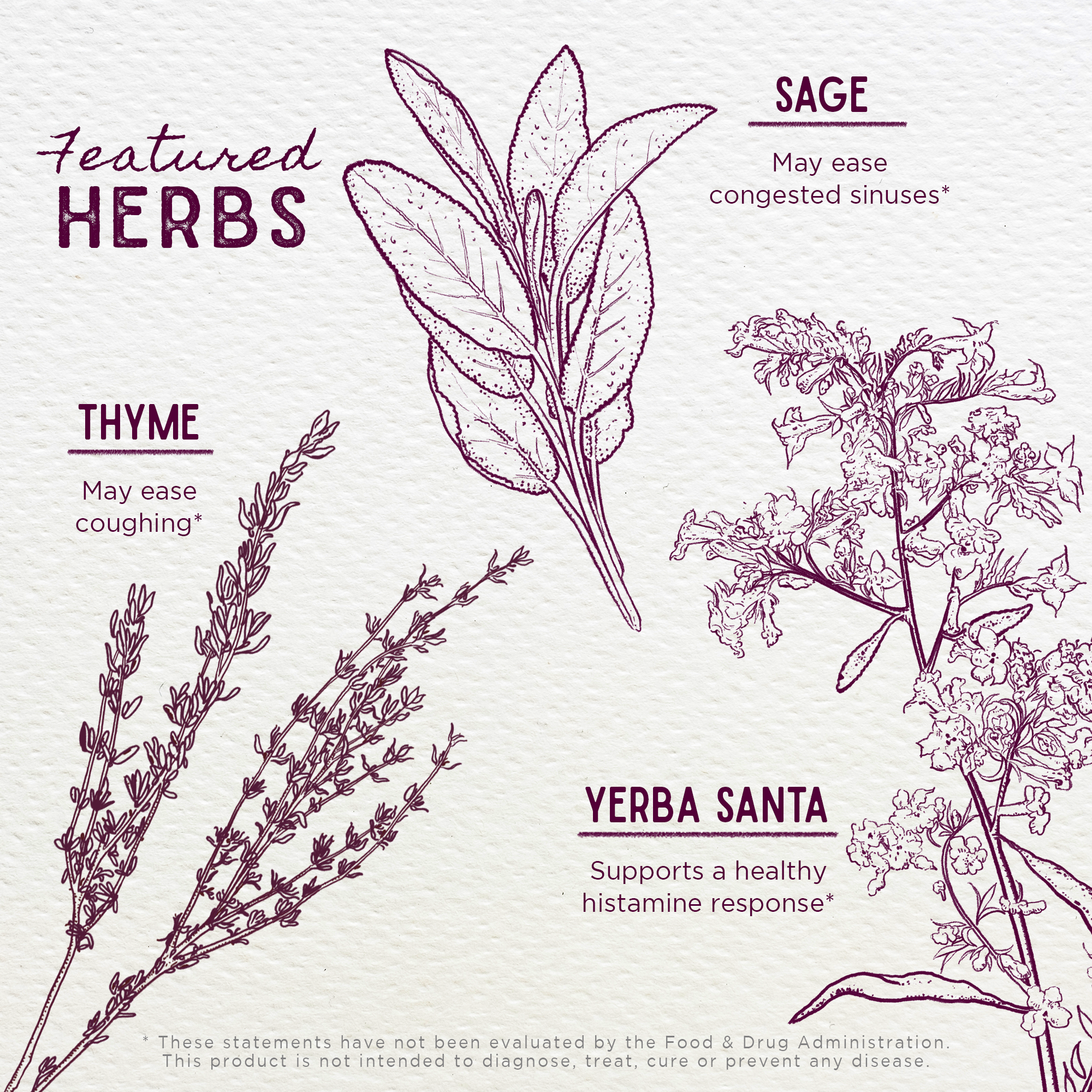 • Thyme leaf: Thymus vulgaris may help soothe occasional cough, supports immune system function, and provides free radical scavenger activity.